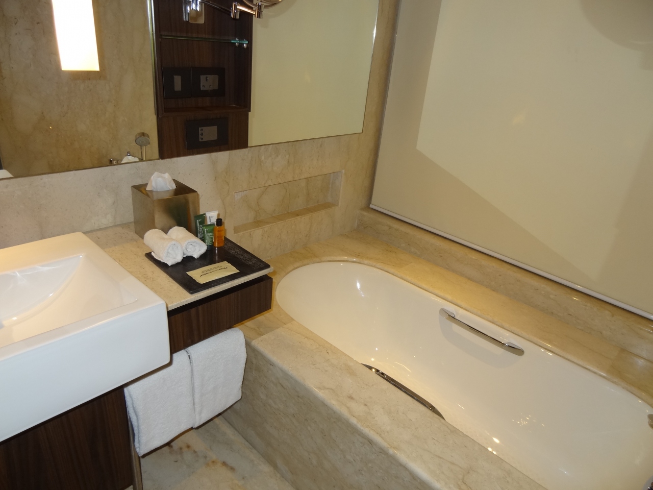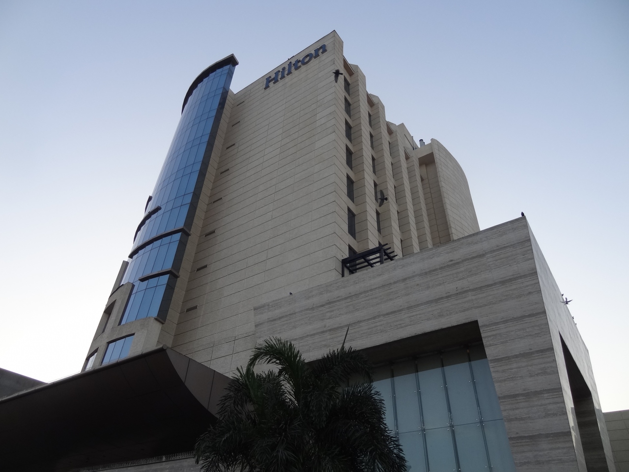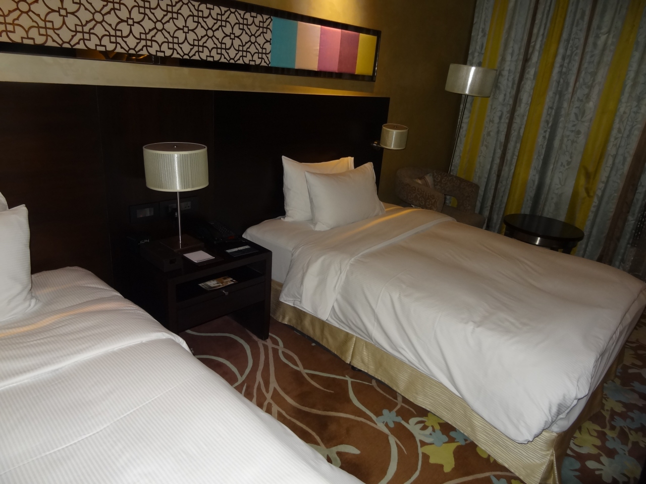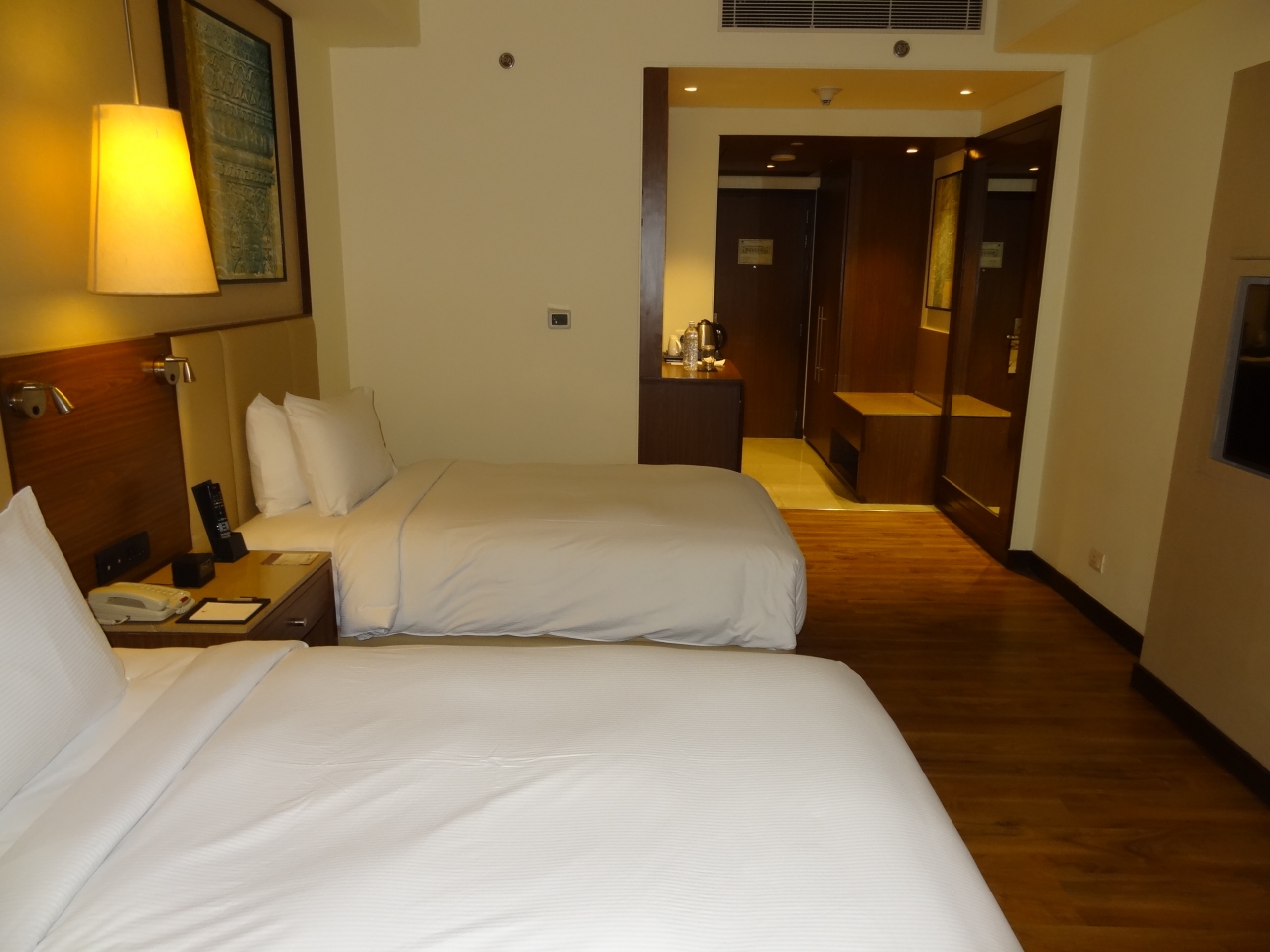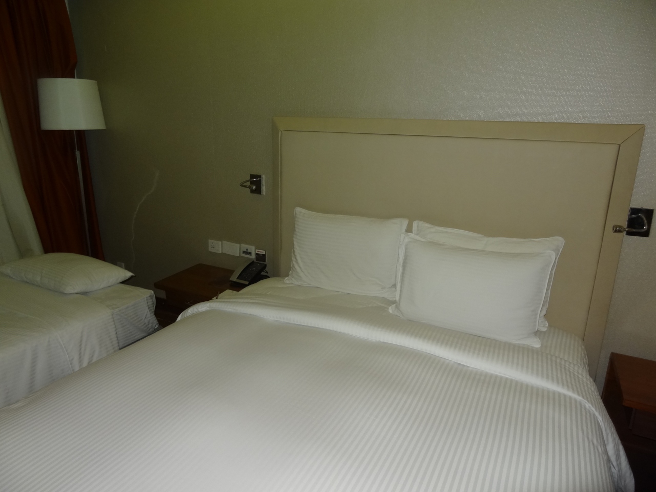 友人と二人の部屋だったが、何とダブルベッドとエキストラベッドの急ごしらえのツイン? 部屋は広いがベッドが2つになって狭くなった。シャワールームに段差がなく、湯を外に漏らさないようにするのが結構大変。遅くチェックインしたため、夕食は食べられなくて残念。ヒルトンらしくセキュリティーやサービスは良い。TVも46インチで見やすかった。ちょっと大きめのミネラルウォーターもありありがたかった。朝食はオムレツをつくって持ってきてくれる。品数はそれほど多くはないが清潔感があふれていた。カレー系はお薦め。