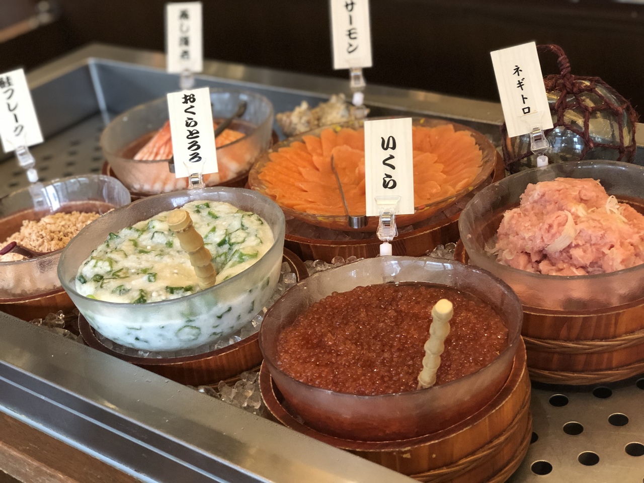 朝食は混むと口コミで見たので、開始時間より15分ほど早めに並びに行きました。三組目でした。いくらに興奮して大盛りにしてしまいましたが、醤油が濃いめだったので後半は辛くなってしまいました。ネギトロを追加して緩和しました。ご飯は普通の温かいご飯と酢飯がありました。食事を終えて出ると、かなりの人数が並んでいました。