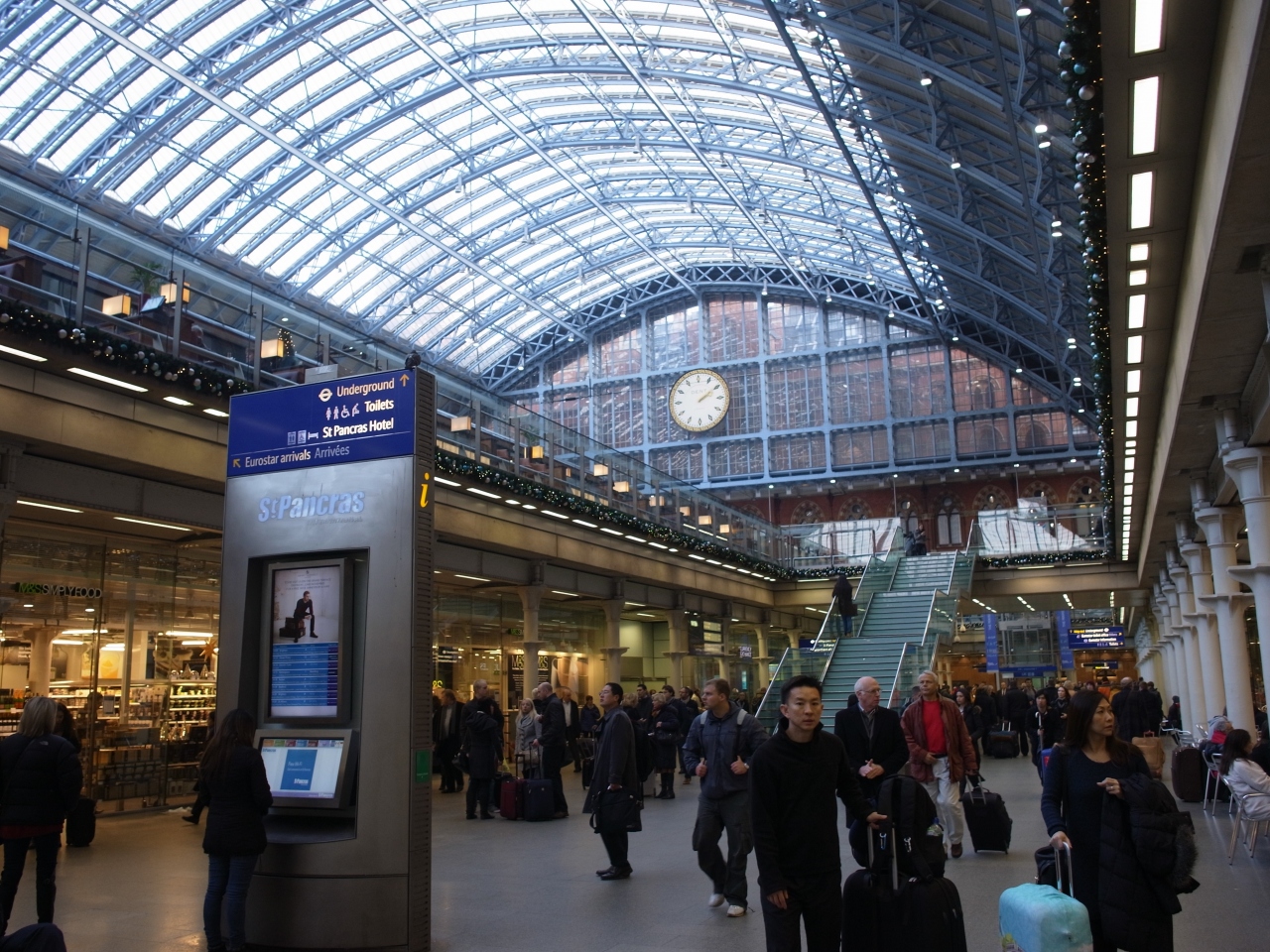 ロンドンの北東、キングクロス駅に隣接して立地するSt.Pancras International駅。ユーロスターが欧州各地とを結ぶほか、ガトウィック空港方面へのローカル列車も発着していて日本人にとっては便利な駅の一つです。ガトウィック空港へはヴィクトリア駅からのガトウィックエクスプレス利用か、バスでのアクセスが一般的ですが、この駅からも直通で行ける上に10ポンドと比較的お安く行くことができます。