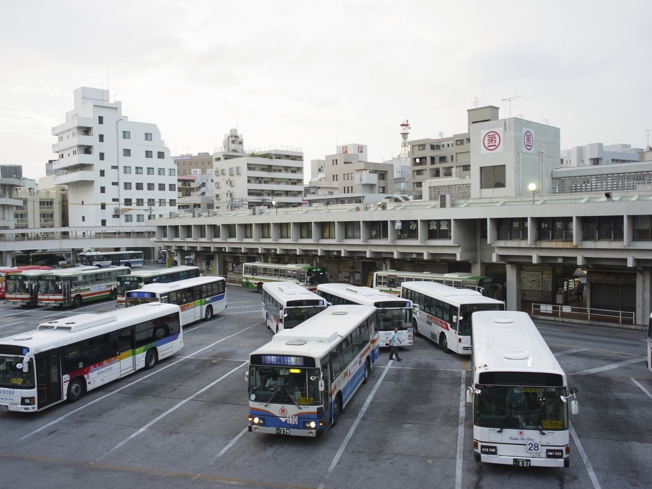 那覇の中心部に立地する那覇バスターミナル。市内各所をはじめ名護など那覇市外とを結ぶ路線の多くが大を発着しています。旭橋駅から連絡通路で接続していて、ゆいレールからのアクセスも容易です。このバスターミナル建物やターミナルの配置がどこか東南アジアのバスターミナルを思い出す造りになっています。