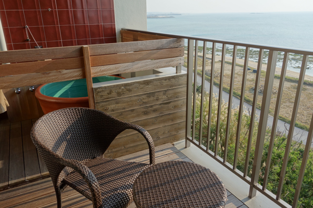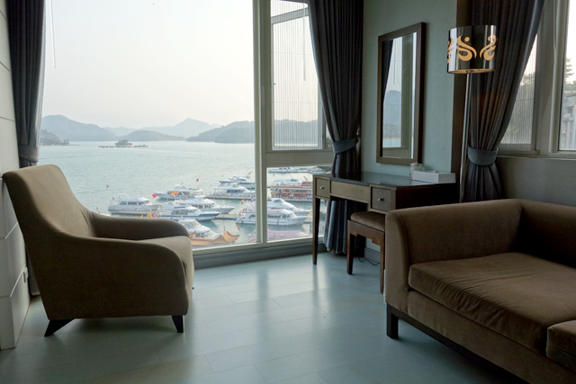 高層階こそないものの、海に面したバルコニーからの眺めは良いですし、館内の雰囲気は大阪のリッツカールトンのような重厚感もありつつ、部屋の設備は最新のものを取り揃えており、居心地も最高。