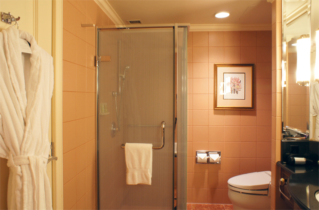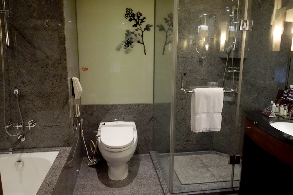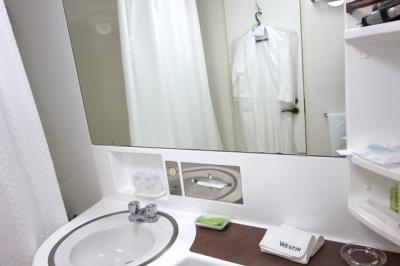 ただ、やはり15年くらい前のホテルなので、電気面ではカーテンが電動ではなかったり、枕元にコンセントがなくて目覚ましにしているケータイが充電できないなどの不便は感じますね。バスルームには、異常に多いタオル類と、厚手のバスローブ。この辺はやっぱり高級ホテルならでは。シャンプーなどのバスアメニティはいつものウェスティンオリジナルで、好きな香り。シンクのあたりとシャワーブースに分かれて、各2本ずつ置いています。