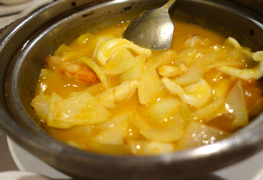 最初の佛跳牆で美味しさのピークをいきなりK点越えしてきたと思ったら、ジャンピングブッダ以上に、軽々とその美味しさを越えてきたコレ。ホタテ、白身、海老、イカと、魚介に、クタクタに煮込まず、食感を残した玉ねぎ。それに南瓜のスープの旨みがこんなに合うなんて!と、二人で驚愕。これらの組み合わせだけなら、フレンチにもありそうなのですが、やっぱりそうじゃないんですよね。フレンチのフォンやコンソメでは、野菜の甘みが加わってしまうから、合わない気がするんです。中華の出汁ならではの、旨みをとことん凝縮した味わい。これが、この料理のポイントだと思います。