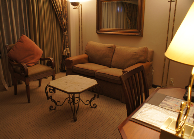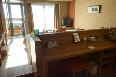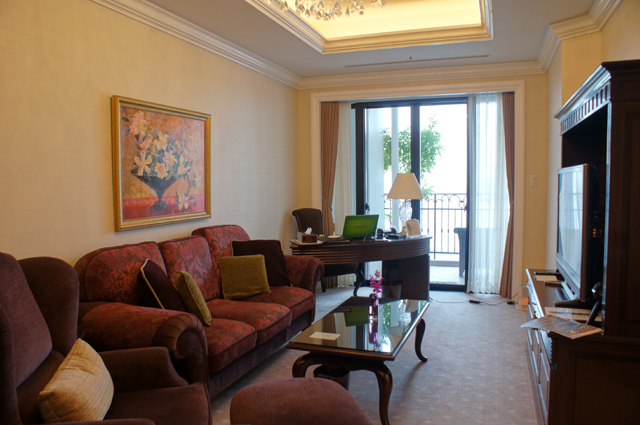 寝室とリビングがドアで隔てられているわけではないので、厳密にはスイートではないのですが、バルコニーも合わせて約70?あるため、ヘタなスイートルームよりよほどスイートらしい造りです。