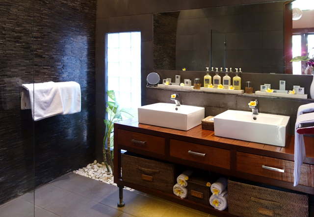 また、何より素晴らしいのはバスルームでしょう。大型で丸いジャグージのお風呂はまるで…ですが、海の見える景色と共にくつろぐには最高。洗い場があるのも、日本人にとっては嬉しいです。昼は陽射しの中で、夜はドリンク台にシャンパーニュを置いて、ゆっくり入るのがオススメ。
