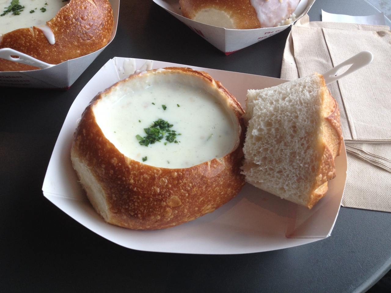 フィッシャーマンズワーフの中で最も有名なレストランがこちらのボーディンベーカリー。店舗自体非常に大きく、大きなパンがごろごろと売り場に並ぶほか、おみやげ物屋さんも併設しており、さらにイートインのようなカウンターがあり、レストランに入らなくても名物のクラムチャウダーを購入することができます。クラムチャウダーは、濃厚でアサリの味が効いていてとても美味しいです。最後はパンだけが余ってしまうのがちょっとツライですが。
