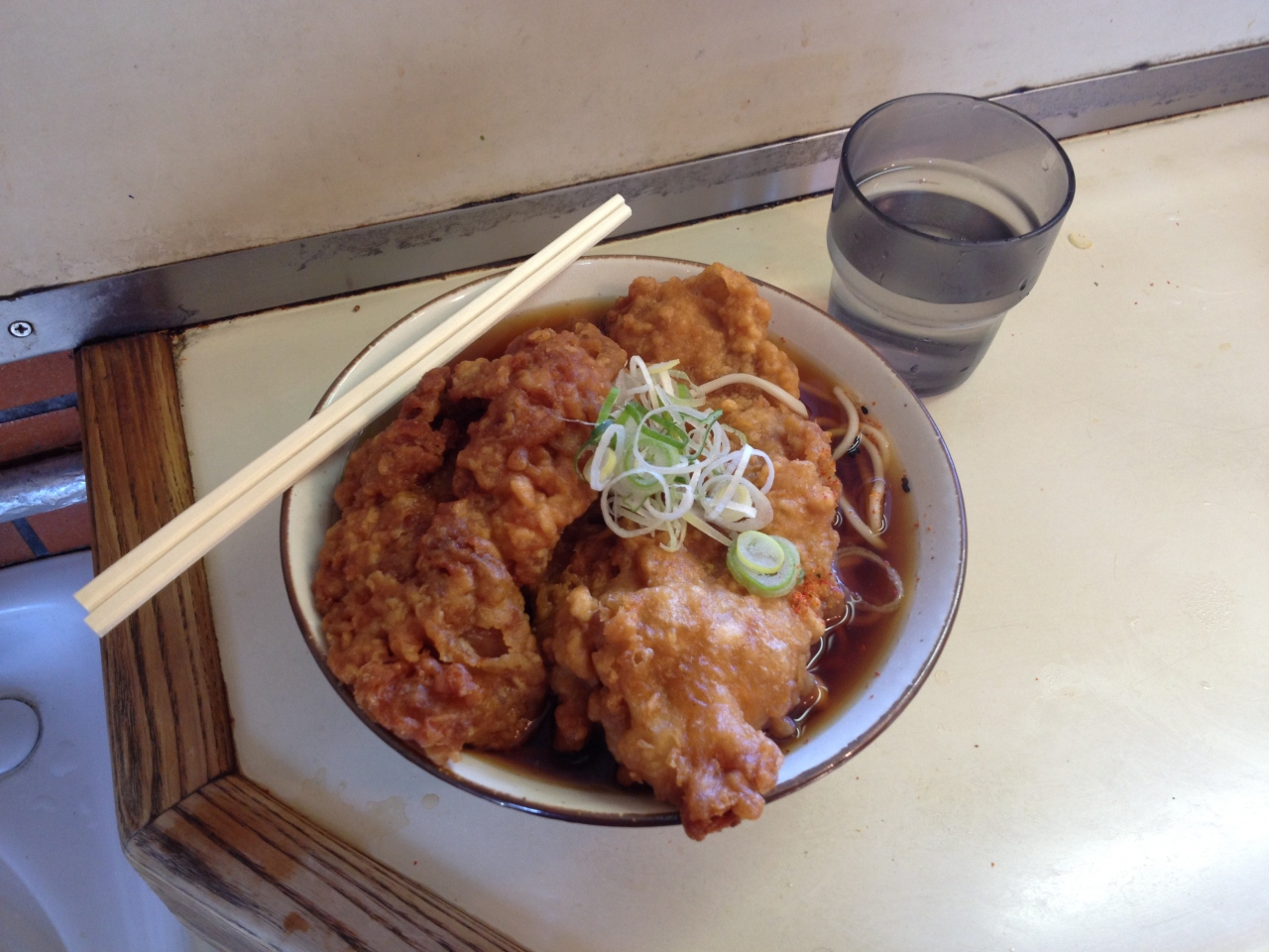 JR我孫子駅の構内にある蕎麦屋さん(うどんもあります)。ここの名物は、巨大なから揚げがのっているから揚げそば。から揚げの大きさは、丼の直径大!から揚げは、1つ入りと2つ入りを選ぶことができますが、お腹に自信のない女性は1つ入りを選んだ方が無難かと思います。