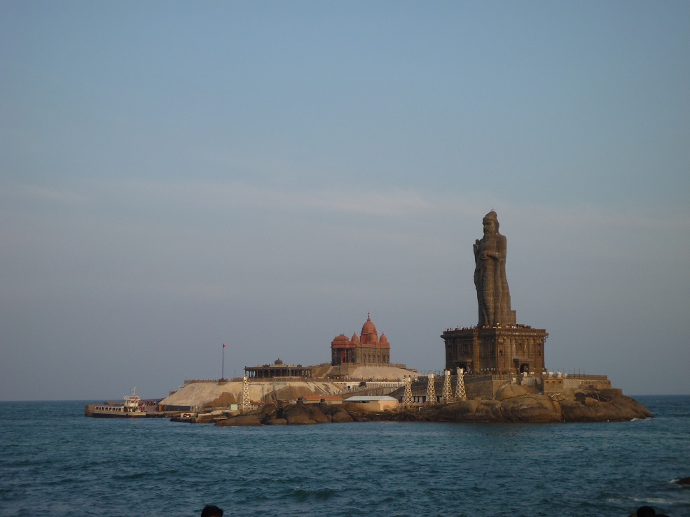 コモリン岬から東の海を望むと、巨大な銅像が見えるのがティルヴァリュヴァールの銅像で、カーニャクマリを象徴する風景となっています。船で土台の部分に上陸できるようです。