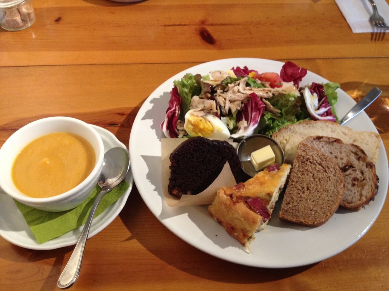 1階はパン屋さんで、2階はパンをメインにランチプレートなどを提供してるカフェになっている。パンは、惣菜パンがメインではなく、素材の味を生かしたヨーロッパなどで売られて入れような形態のずっしりしたパンを丸ごと売っているような感じ。