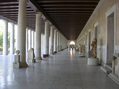 内部には、様々な建物がありますが、建てられた当時の姿を完全に復元されているのがアタロスの柱廊博物館です。支柱が一直線にキレイに並んでいる姿がとても美しいです。この姿をみていると、当時のアテネはさぞかし美しい建物が沢山建つ街だっだんだなぁと実感できます。内部は、これは一体何に使っていたんだろうという、思うような石の道具など、古代のアゴラから掘り出されたものが展示されていました。
