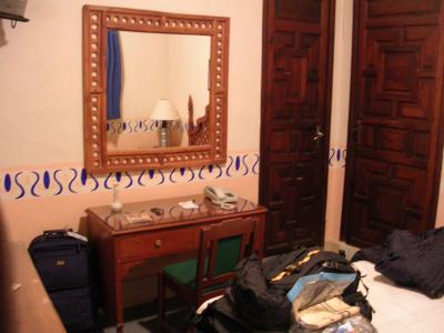 グアナファトに到着する夜に事前に予約して行きました。深夜の到着だったので空港からはタクシーで向かいましたが、中心地にあるためホテルの前にはタクシーを横付けできず、近くから歩いていったのですが、うっかり裏口に行ってしまい、結局電話をして裏口まで迎えにきてもらいました。本当は、公園に面した側に、ちゃんとしたエントランスがあるので、くれぐれもお間違いなく。部屋は小ぢんまりとしていますが、とてもきれいでした。建物自体も昔のたてものを生かした作りで、カラフルでグアナファトっぽい建物です。