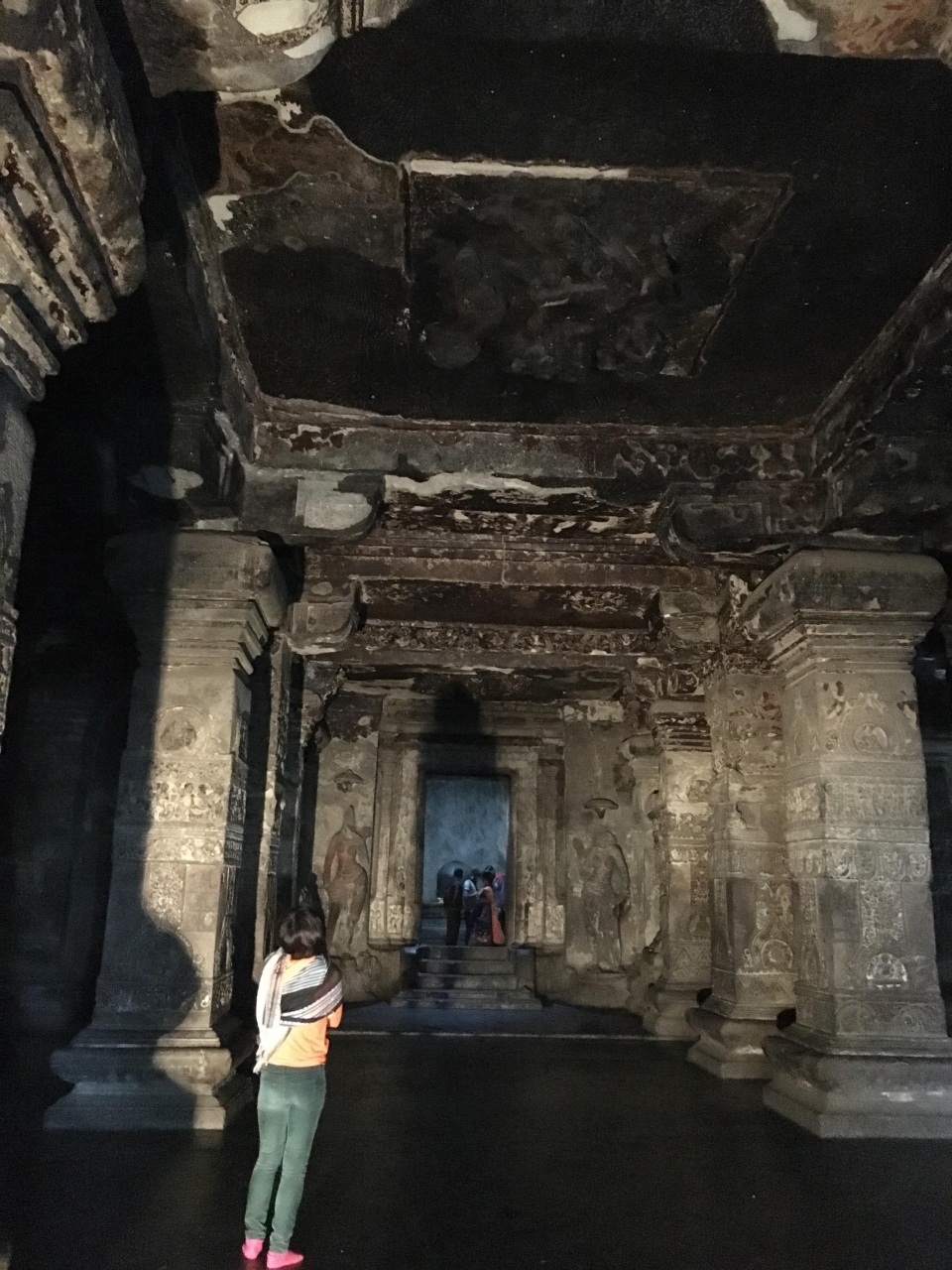 エローラ遺跡の中で一番の見どころです。エントランスを入るときれいなお庭が広がっているのですが、その奥に強烈な存在感を示しているのがカイラーサナータです。コブラムの原型となったと言われる門をくぐると、ドカンと寺院が鎮座しています。壁には細かな彫刻がこれでもかとあるだけでなく、ミナレットのような柱も。これを岩から切り出したとは、到底信じられませんでした。寺院の右手側の丘には登ることができますが、事故が多発しているようで、自己責任ですので注意してください。