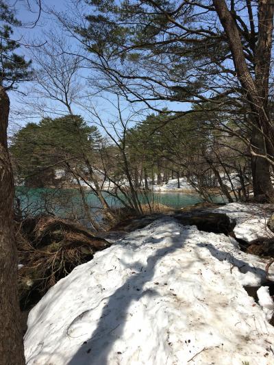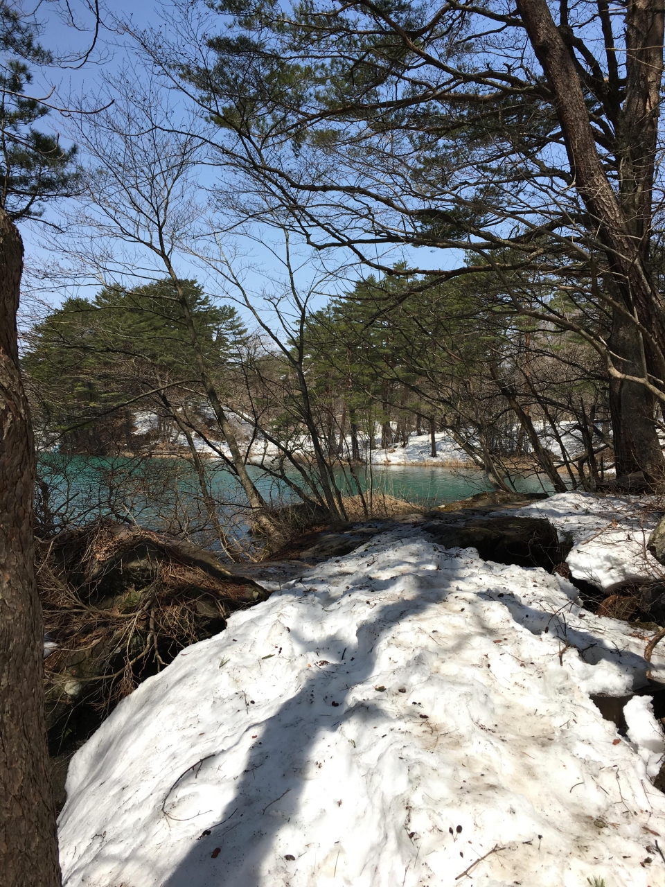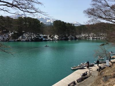 猪苗代湖から車で20kmほど北上した場所にある、湖が集まっている観光地です。その名の通り、湖の色がいろいろと変わって見えることから名前がついたようです。4月の中旬に訪れましたが、まだ雪が多く残っており探索路は進むことができなかったので、時期には要注意です。ただ、毘沙門沼は広い駐車場も完備しておりそこまでは無事行くことができ、湖を眺めることができました。背後の山々とエメラルドに輝く湖の良い絵が取れました。