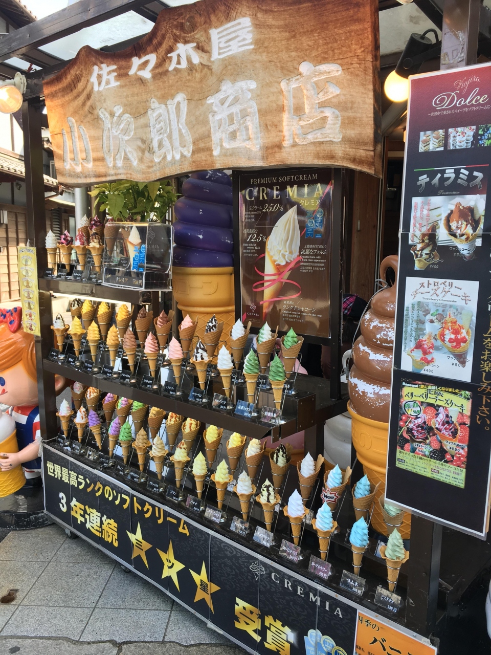 錦帯橋から吉香公園方面に進むと、まず目に飛び込むのが世界一多くのフレーバーを取り扱っているソフトクリーム屋さんがありますが、さらに数十メートル歩くとこちらのお店があります。最初のお店はちょっと見た目が雑多な感じがしていましたが、こちらは見た目もちゃんとしており好感が持てる感じです。こちらの種類もおそらく世界2位くらいのフレーバーの多さです(笑)ソフトクリームを購入して、吉香公園で食べるのが良いと思います。