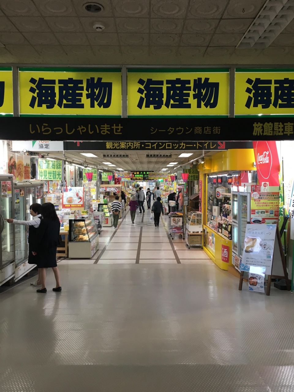 両津港のターミナルビルの2階にあります。到着ロビーを抜けると、まっすぐ続く通路添いの左右にお土産物屋さんが並びます。佐渡のお土産物はほぼすべてそろうと思います。早朝は閉まっているので、両津港に泊まっている人が朝早く行くときは注意が必要です。