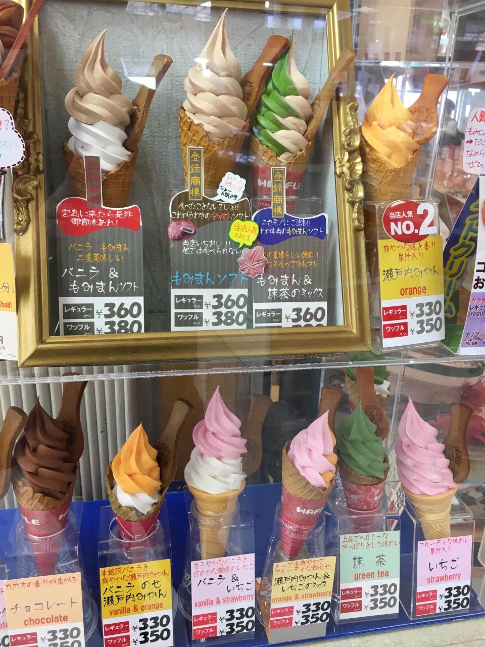 宮島を訪れた後、本土のフェリー乗り場の目の前にあるもみじ本陣の中にあります。このお店の一番人気は、もみじ饅頭味のソフトクリーム、その名ももみまんソフト!チョコにも似た香ばしいソフトクリームに、しゃもじの形をしたせんべいがトッピングされています。話のネタにはちょうど良いソフトクリームでした。