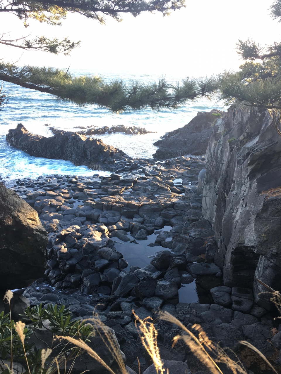 東伊豆の中頃にある、岩場の海岸線が続くエリアです。遊歩道が整備されており、有名な門脇の橋を起点としてピクニックが楽しめます。伊豆高原駅方面に海岸沿いを進むと、橋立のつり橋がありますが、そこの下には柱状節理という亀甲状の岩場があり必見です。
