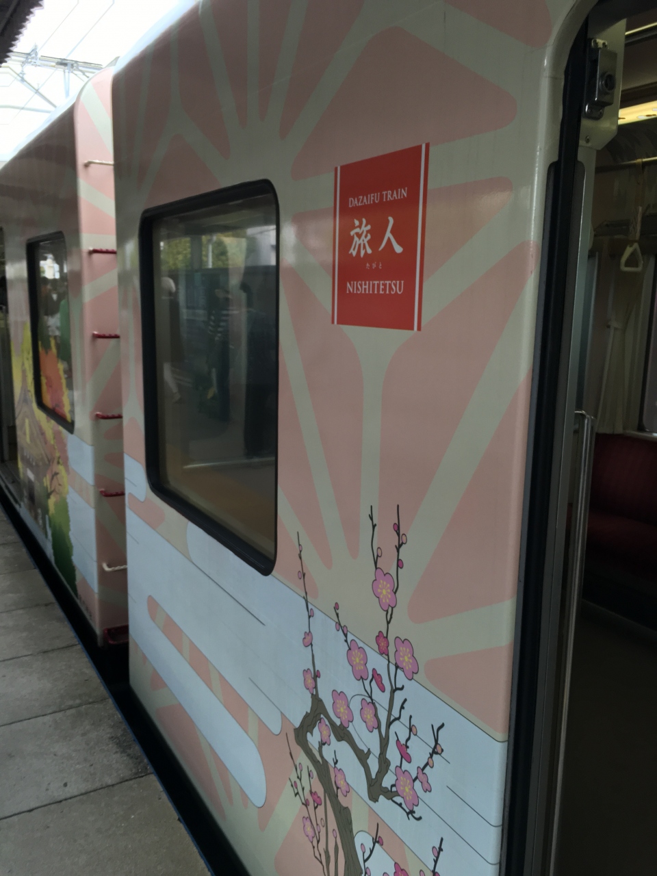 大宰府を訪れた際、西鉄二日市駅から大宰府駅までこの列車に乗りました。初めての大宰府で楽しみにしていた矢先、このような列車がホームにやってきたのでテンションがさらに上がりました。外見はピンク色でかわいい感じのカラーで、車体には大宰府の梅の絵などが描かれています。この路線がすべてこの列車なのかはわかりませんが、是非こちらの列車が来たら乗ってみてください。