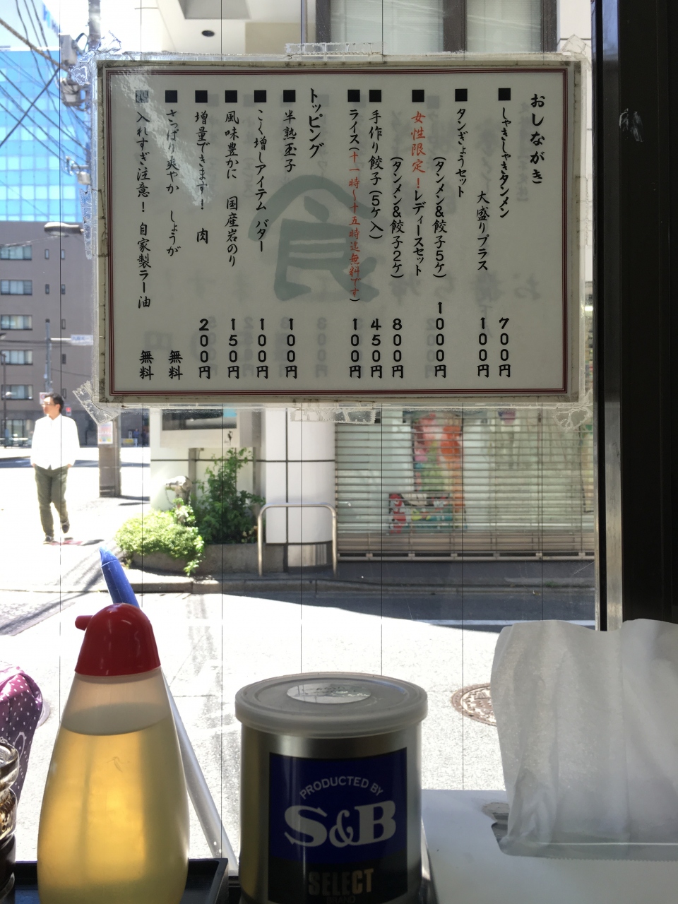 本当はこのお店の向かいにあるラーメン屋に行きたかったのですが、そちらには行列が出来ていたので、代わりにこちらを訪問。タンメンは非常にあっさりとしていて美味しいですが、物足りない人にはテーブル上に各種調味料があるので自分好みの味にできるのが良かったです。