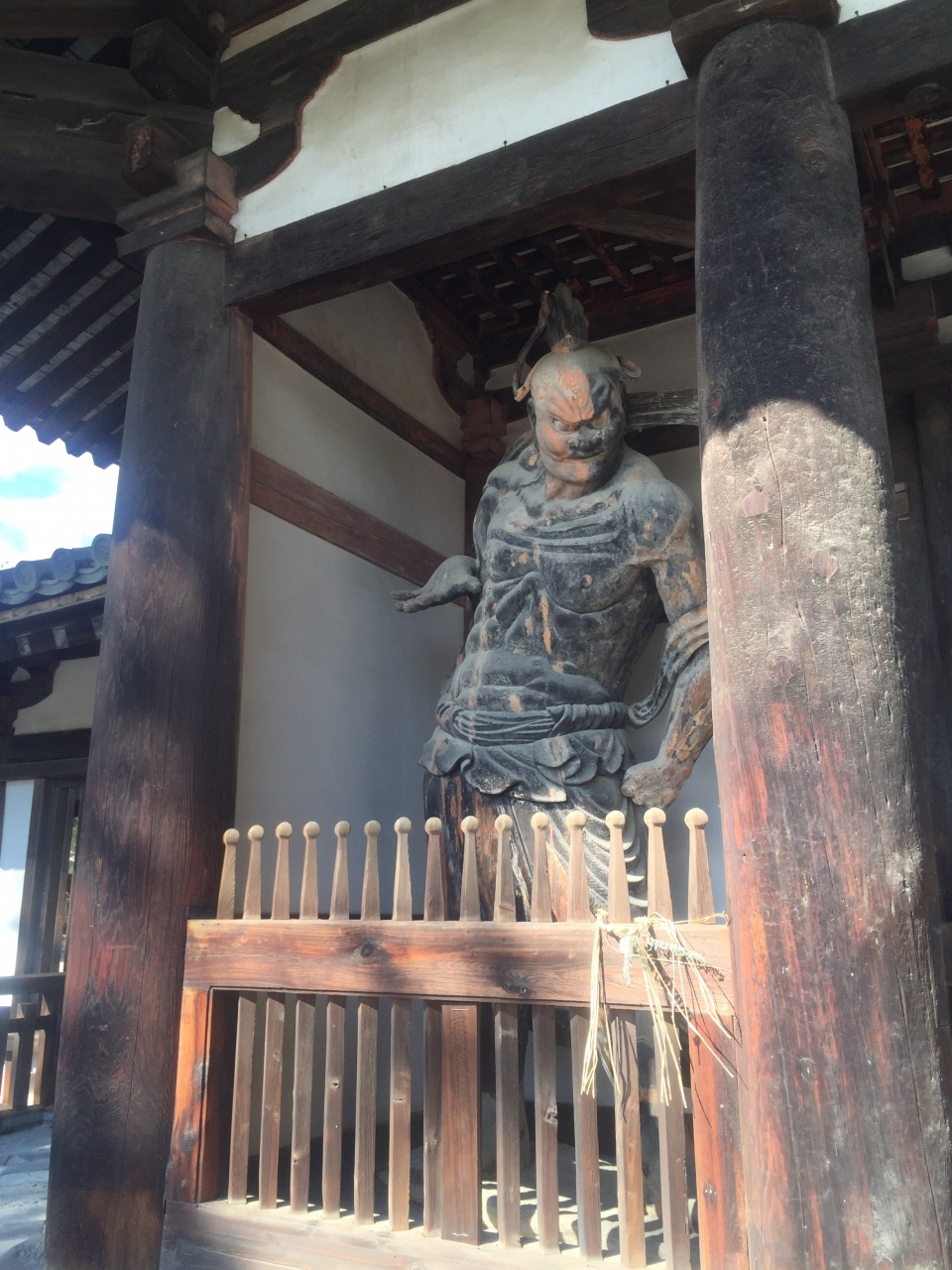 五重塔や金堂があるエリアに入るための門です。左右には金剛力士像があり、日本最古のものとか。力強さがあふれる様は、とても印象に残っています。少し離れた場所から門を見ると力士様が門番として立ちふさがっている様子がよくわかります。