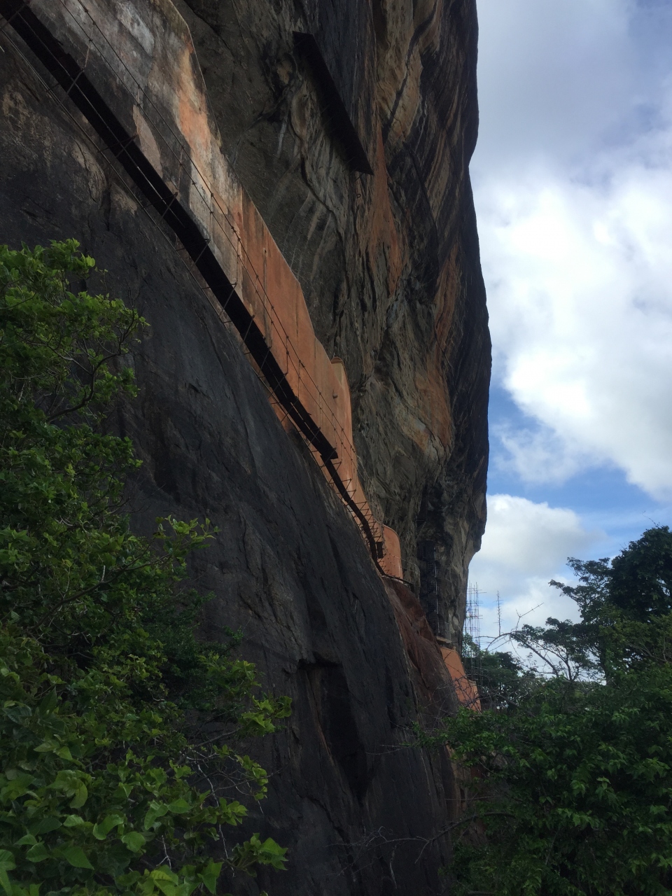 シギリヤロックを登っていく途中にある回廊です。今では触れないようになっていますが、昔は沢山の人が触ってピッカピカになったのだろうと思われます。ロックの一部分だけがピカピカなのですが、下から見上げてもその部分だけが茶色くなっているのですぐに分かります。