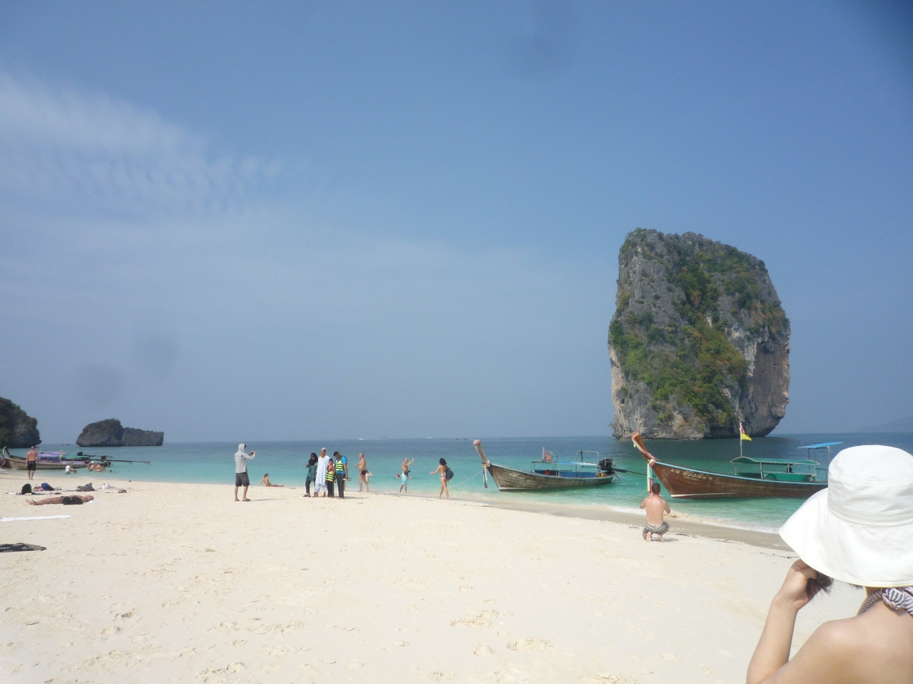 タイのリゾート、クラビでアイランドホッピングツアーに参加して、最初に向かった島がこの島でした。ライレイビーチもキレイですが、外海に出るとそれとは比にならないくらいの美しさで度肝を抜かれました。近くに停泊している船は、影が水底に映っていて、まるで宙に浮かんでいるようでした。
