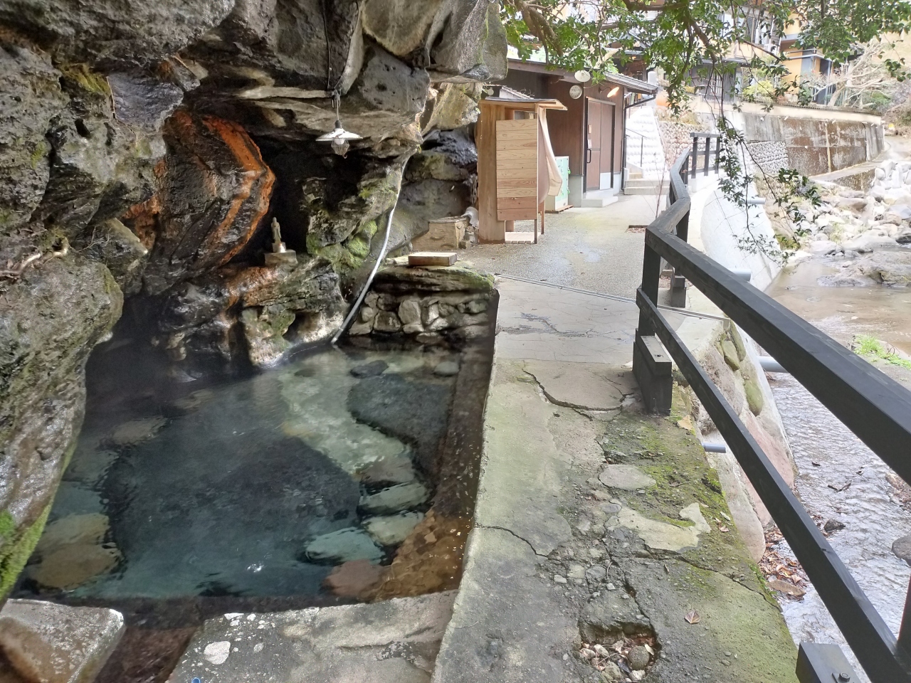 こちらの目玉は川沿いにある天然の岩風呂。混浴の大きな岩風呂の他、女性専用のお風呂もあるので女性も安心です。