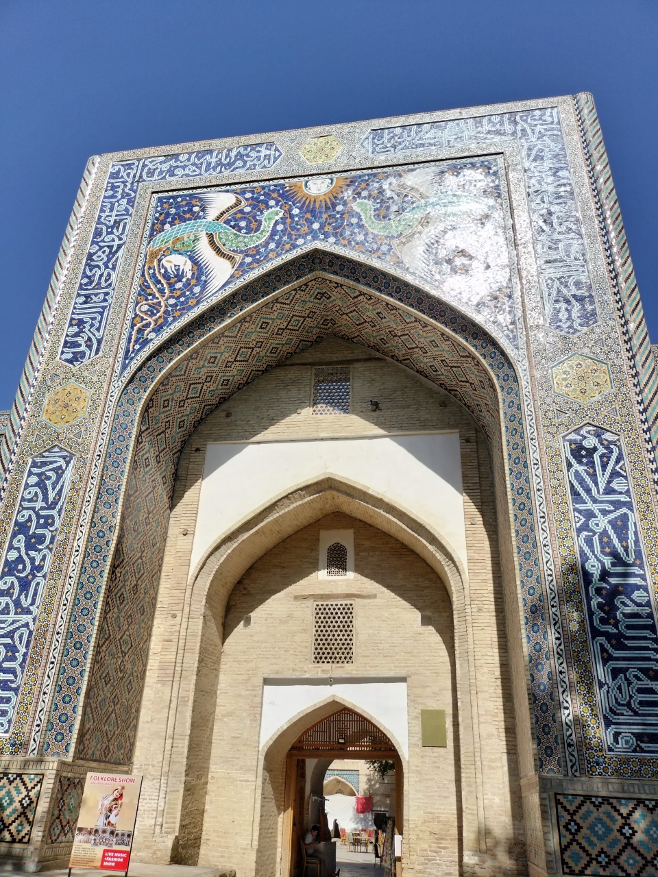 ブハラのラビハウスという旧市街の南に位置する小さな池があるのですが、その目の前に建っているメドラサです。特筆すべきは正面に描かれている模様。一番上には人の顔がありその左右にはキレイな鳥が小さなヒツジを捕まえているという珍しいもの。内部はレストランになっているようですが利用はしませんでした。ラビハウスの散歩がてら立ち寄るのが良いと思います。