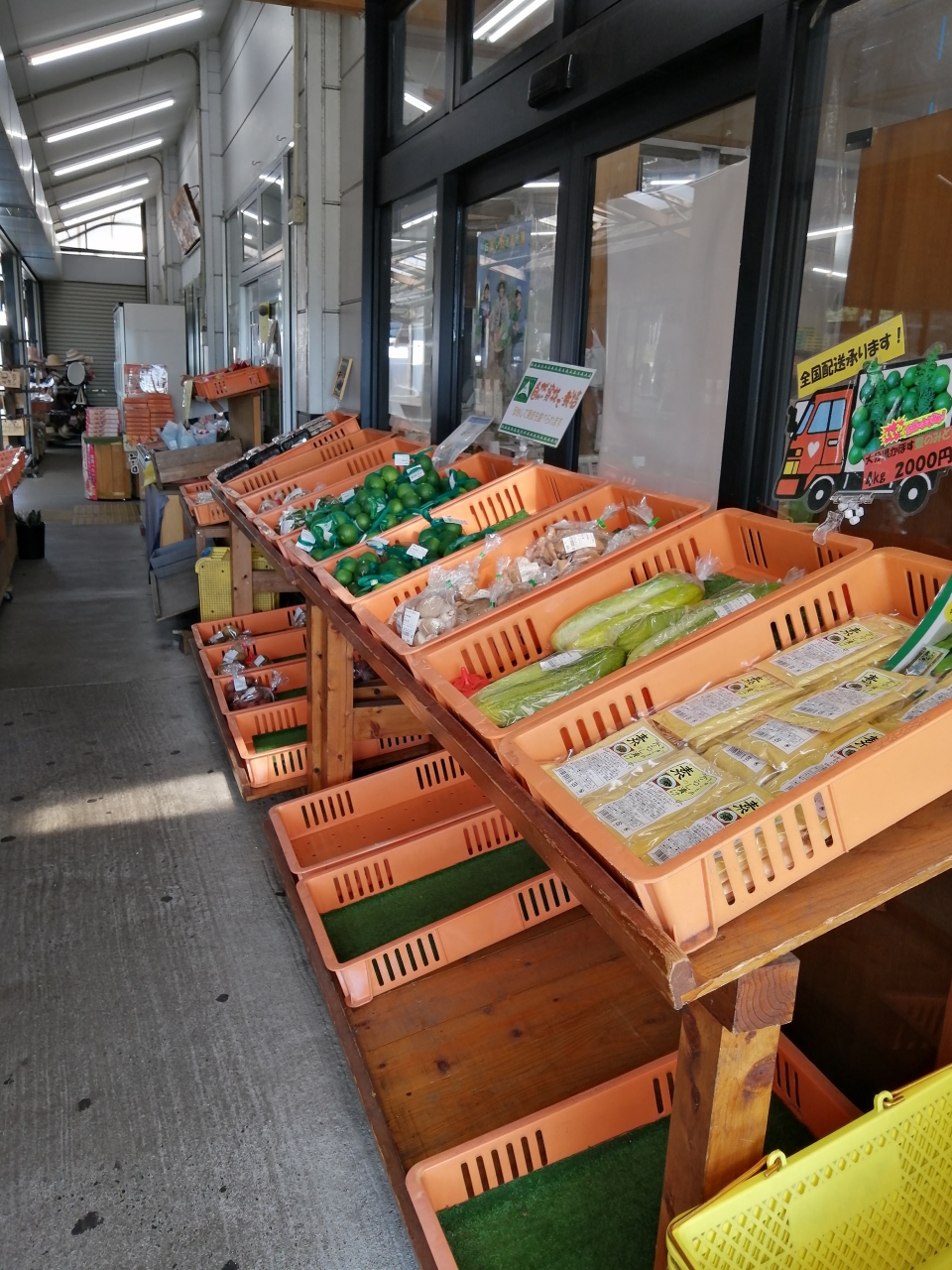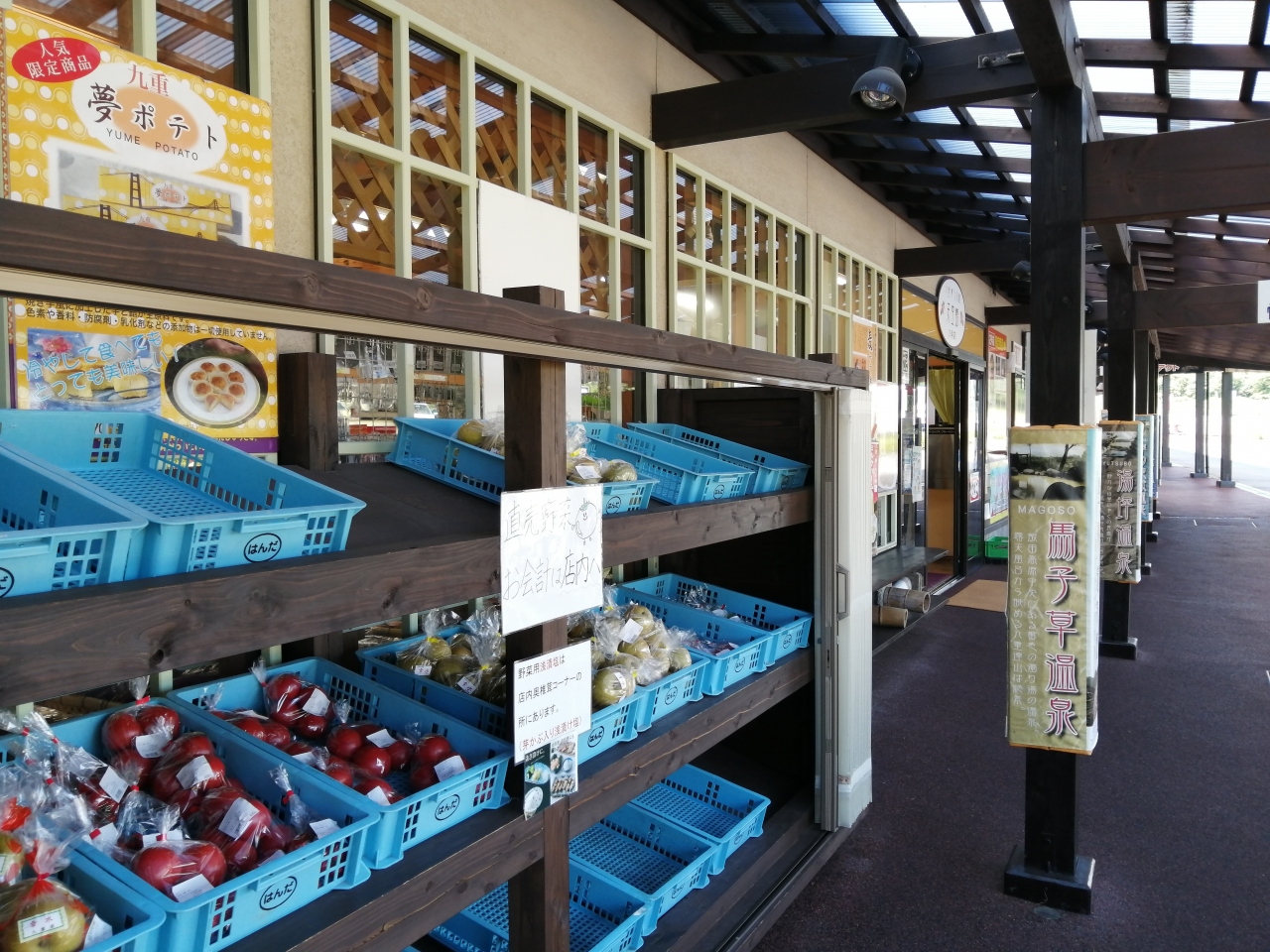 九重”夢”大吊橋の売店エリアにある農産物直売所です。建物の外にも商品が並んでいます。中ではソフトクリームも購入できました。