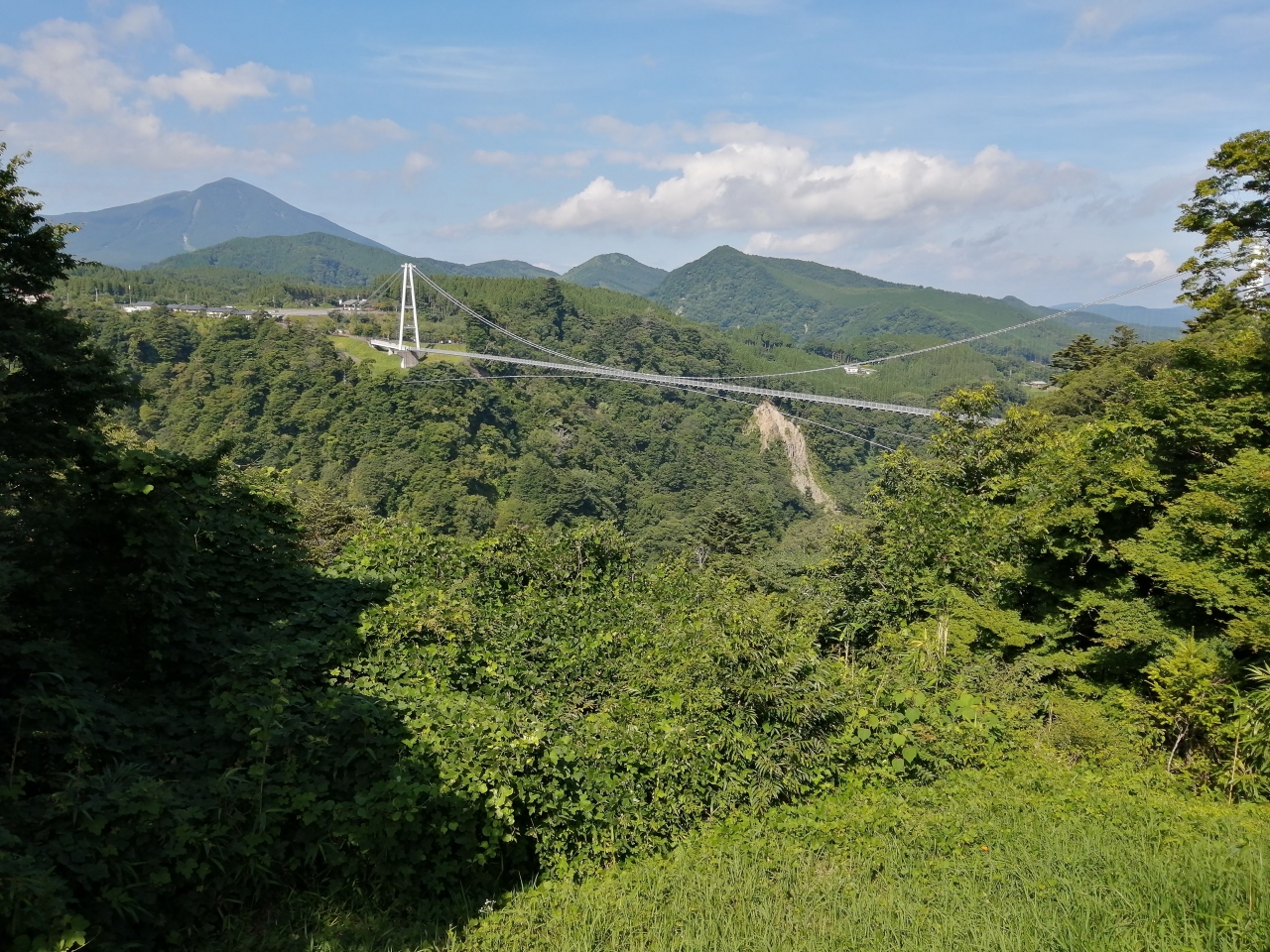 湯布院の黒川温泉の中間地点にある、日本一の高さを誇る歩道専用吊り橋です。チケット料金は500円と良心的です。栄えていない東側から入りましたが、橋までは少し歩いた場所に無料の駐車場があります。