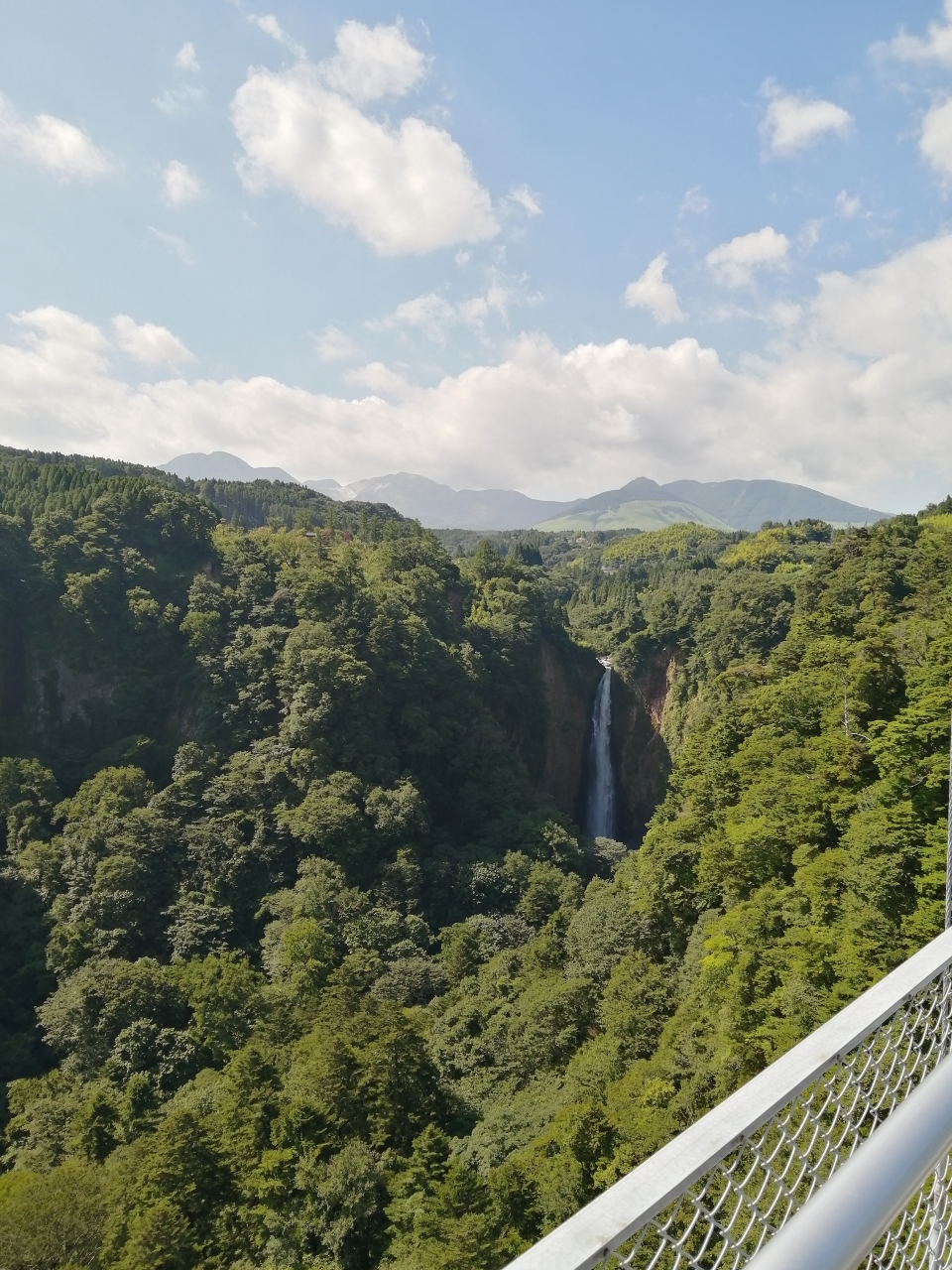 九重「夢」大吊橋を渡っているときに、遠くに巨大な滝が2つ見えてきますが、右側にあるのが震動の滝です。遠くにありますが大きな滝なので存在感はばっちりでした。写真を撮りたいと思うのですが、カメラを落とさないようにとついつい慎重になりました(笑