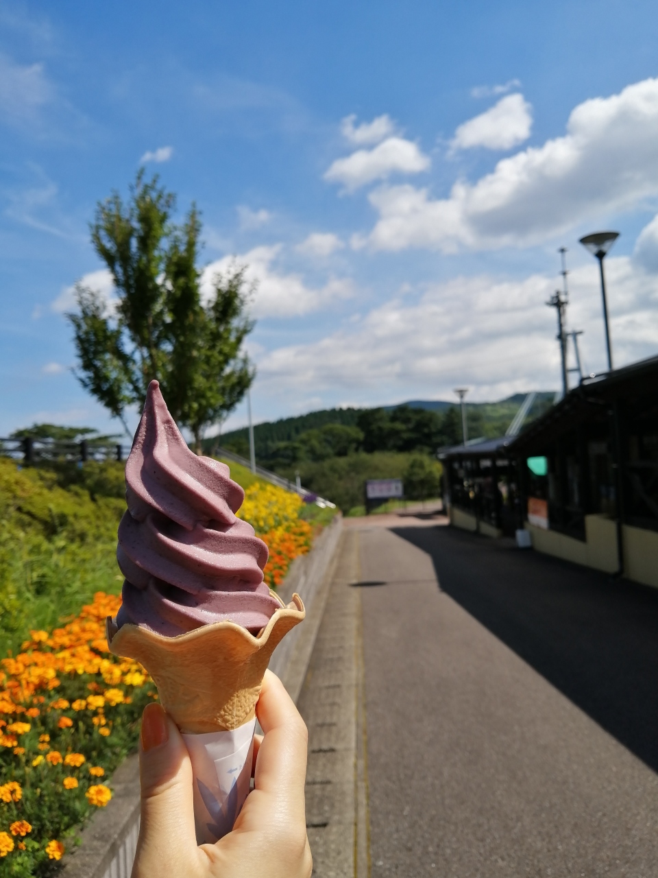 鉄輪エリアから海に向かって車で10分ほどの場所にあります。産直市場になっていて、地域の野菜が多く並んでいて、多くの人で賑わっていました。観光客としてお目当てになりそうなのは大分産のざぼんを使ったザボンソフトクリーム。良い香りがして美味しかったです。