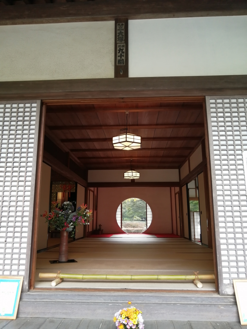 北鎌倉駅から徒歩で10分ほど歩いた場所にあります。10月に行ったのでアジサイはなかったですが、シーズンに行くとアジサイでいっぱいのようです。ただ、こちらの目玉はアジサイだけでなく、奥にある本堂の丸い窓。和室奥にある満月のような丸い窓から奥の庭園が見える様は、一枚の写真のようでキレイでした。