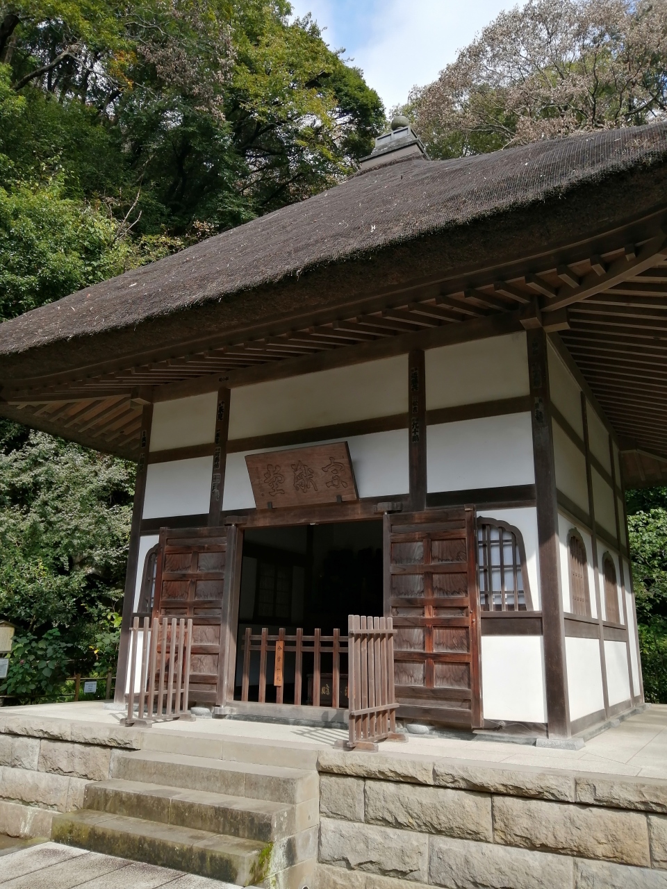 JR北鎌倉駅から徒歩で10分ほどの場所にあるあじさい寺で有名な明月院の中にあります。本堂からさらに先に進むと、岩を背後にしたやぐらのお地蔵さんがいるのですが、その目の前に建っている建物です。「宗猷堂」と表示があるのですが読めない・・・。土台は石で固められており重厚な感覚をうけましたが、屋根は茅葺で、絶妙なバランスに見えた建物でした。