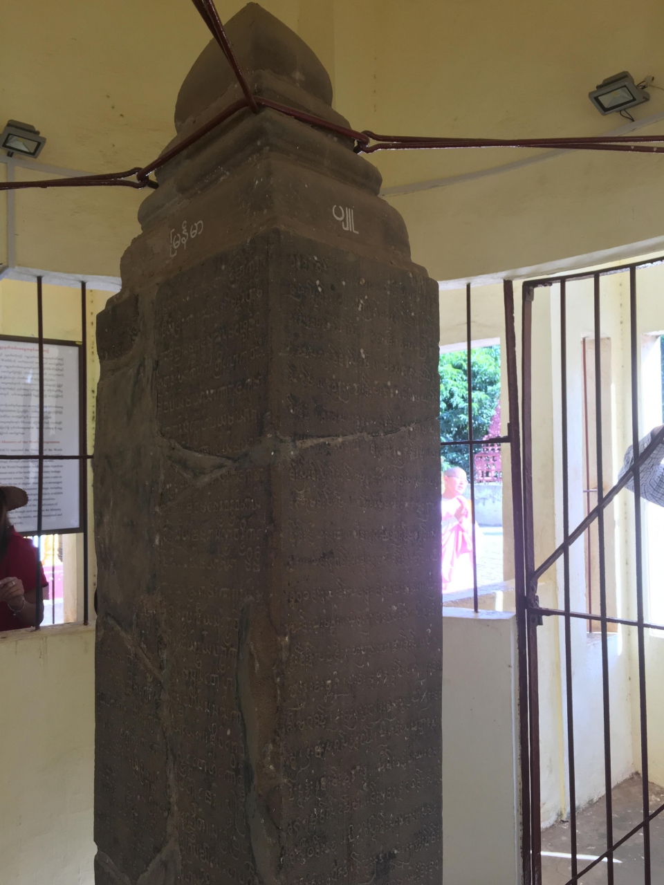 オールドバガンから少し南下したところにある寺院群の中にあります。グービャウィヂー寺院の奥にあり、google mapを見ながら行ったのですが、少し場所が分かりづらかったです。ここの見どころはミャゼディ碑文と呼ばれる石碑。4面にそれぞれ言語が異なる文字で文章が書かれています。それを見に行く人が多いのでゆっくりはなかなか見るのが大変でした。