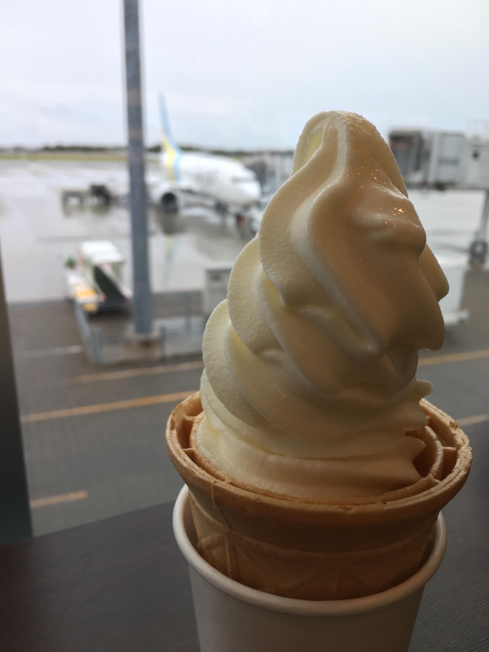 搭乗待ちの待ち時間をこちらの売店で過ごしました。搭乗フロア内にはこちらの小さな売店があり、軽食が食べられます。もちろん北海道名物のソフトクリームもあるのですが、生乳味のほかに、白い恋人のソフトクリームもありました。飛び立つ飛行機を眺めながら、最後にゆったりと食を楽しめました。