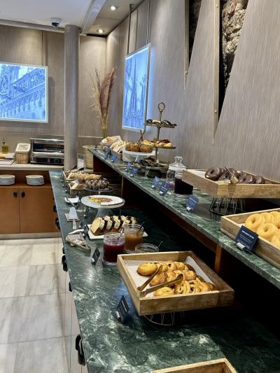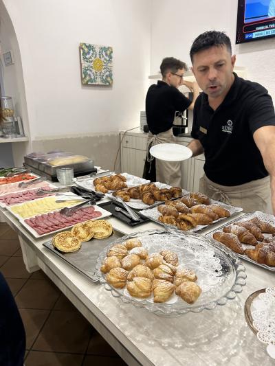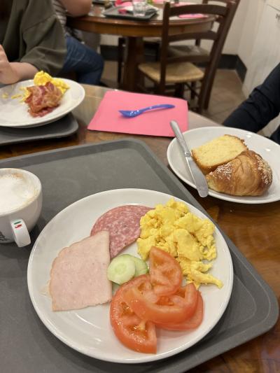朝食の甘いパンやベーコン、卵などはスタッフに頼んで取り分けてもらうスタイル。トマトやルッコラも用意されていて充実してました。