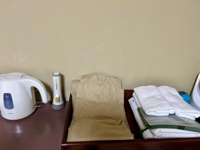 部屋着は丈の長い上着のみ、アメニティはフロントに置いてある物を自分で取る方式。
