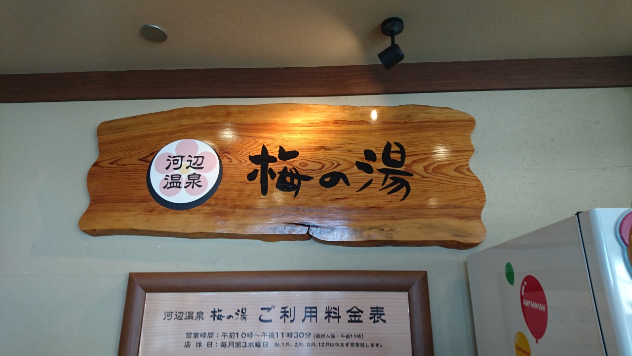 室内の主浴槽は混んでいました。屋外(屋上)の露天風呂がいくつも有り、所々が空いていました。ひのき湯の源泉掛け流しに浸かりました。このひのき湯がいちばんかな。いわゆるヌルヌルのお湯で、アルカリ性単純泉だそうです。ちゃんと熱いお湯でした。「梅の湯」の伝説が掲示されています。