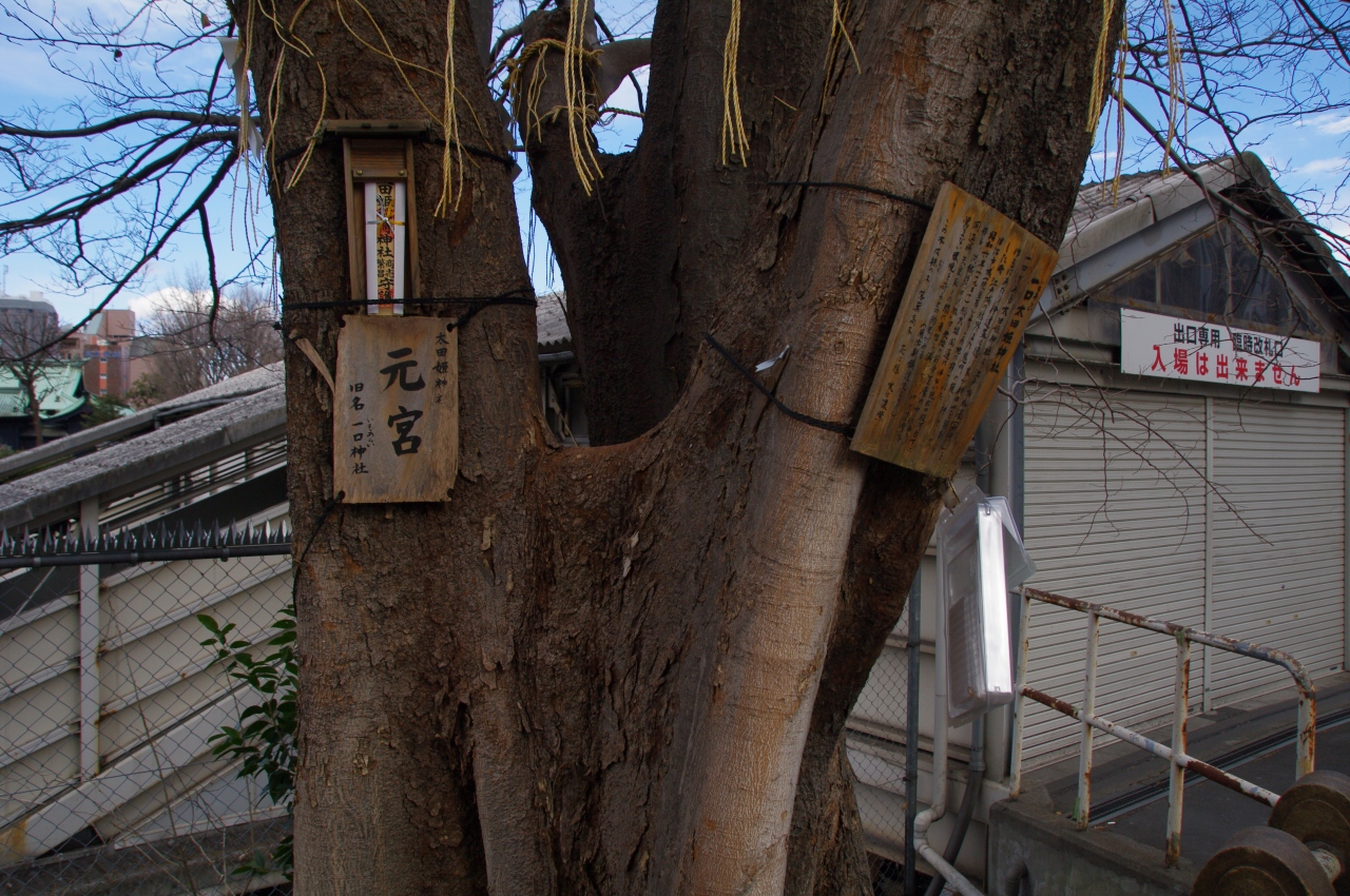 かつてこの辺りに神社の社殿が有りましたが、それが鉄道建設のため、移転したそうです。このムクノキだけ残り、この木に「元宮」を示す札が掲げられています。この木が神社なのだと思います。
