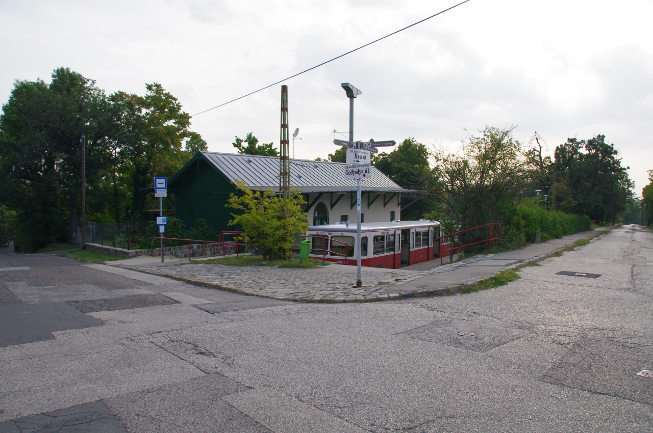 Városmajorの停留所の横が登山鉄道の駅です。早朝はとても閑かでした。やがて電車が来ました。ラックレールが敷かれており、歯車で登る電車です。車内に自転車置き場が有り、サイクリングの人も乗っていました。ゴトゴトと電車が登りました。約20分で終点のセーチェニ山(Széchenyi-hegy)に到着。