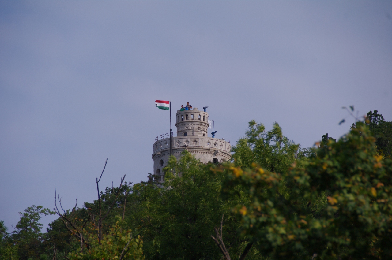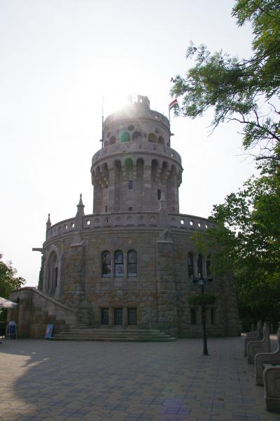 坂を登ると、エルジェーベト展望台(Erzébet kilátó)に到着。この辺りが標高527mヤーノシュ山(János-hegyi)頂上です。クラシカルな展望台はドアが閉まっていましたが、押すと開きました。階段を上ったのですが、階段が次々と続いていました。この展望台が高いみたい。展望台のてっぺんへ上がりました。風が強かった。360度の素晴らしい見晴らしでした。ブダペストの中心部は見えず、辺りの美しい森の景色でした。