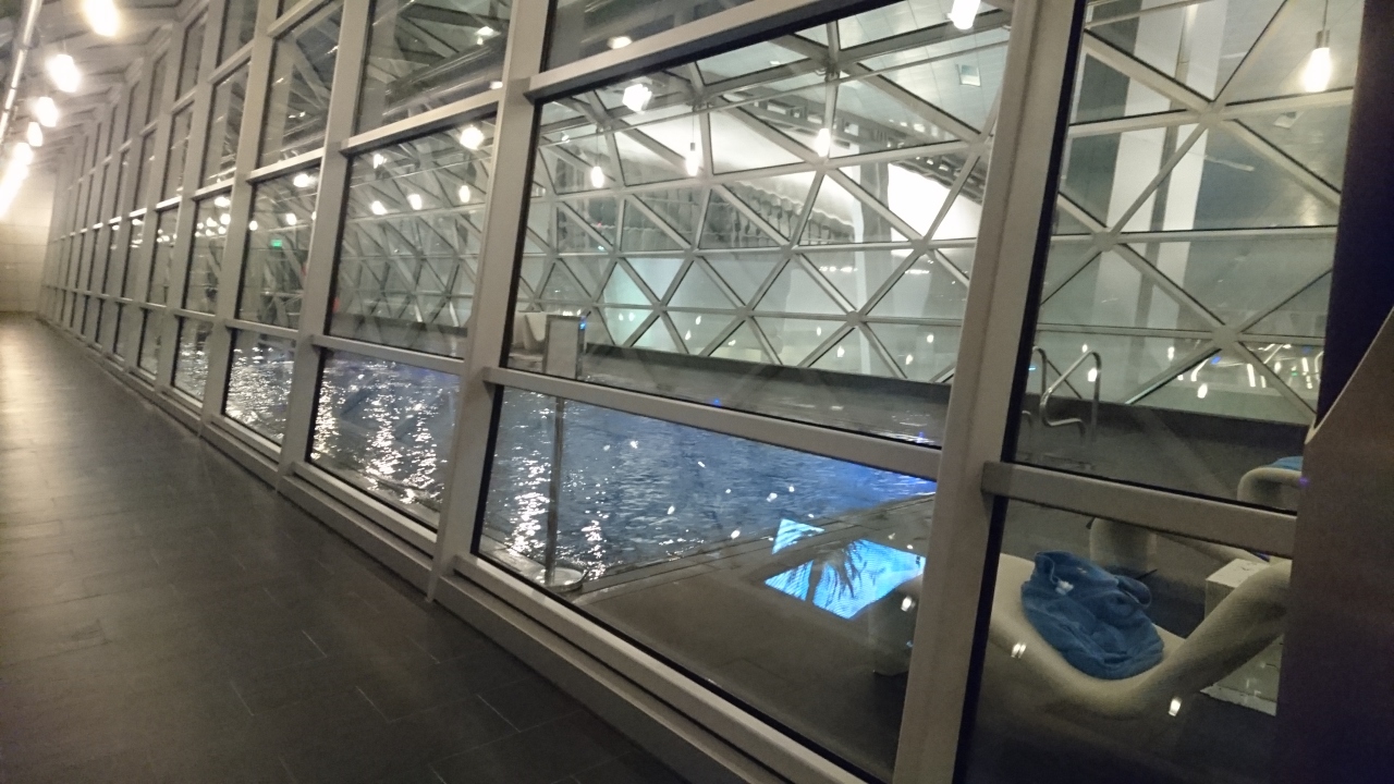 プールへ行きました。現地時刻で深夜の1時頃。外は真っ暗。プール内も暗めでした。ブルーのイルミネーションが施されていました。とても幻想的なプール。25mのこのプールは青いタイル貼りで、とっても美しかった。このプールはターミナルのフロアの上で橋のように架かっていることが分かりました。すごい建築です。