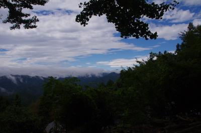 ようやく高山不動尊と同じ高さに到着。せっかく登ったのですが、ここでちょっと下りました。不動尊の直下に来ました。晴れてきました。ここの見晴らしが素晴らしかった。晴れてきました。急な石段は踏み面が狭く、濡れて滑りやすそうで、おっかなかった。