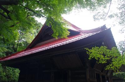奥の院へ向かい急坂を登りました。この辺りで雨具をしましました。林道に出ました。林道と登山道が有り、登山道が急坂だったので、ちょっとだけ林道を歩きました。最後の登山道をひと登り。