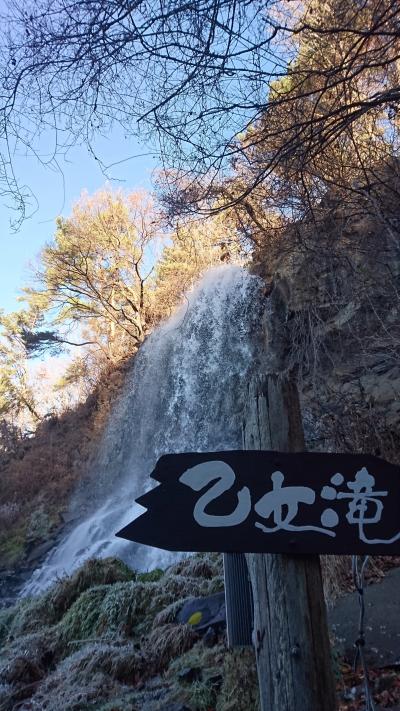 次に下流側へ向かい、川沿いを歩きました。草に霜が付いていました。旅館から約10分で乙女滝に到着。こちらは豪快でした。横谷峡に注ぐ支流の滝のようです。高台に上がると、木戸口神社が有り、お参りしました。- 旅行時期