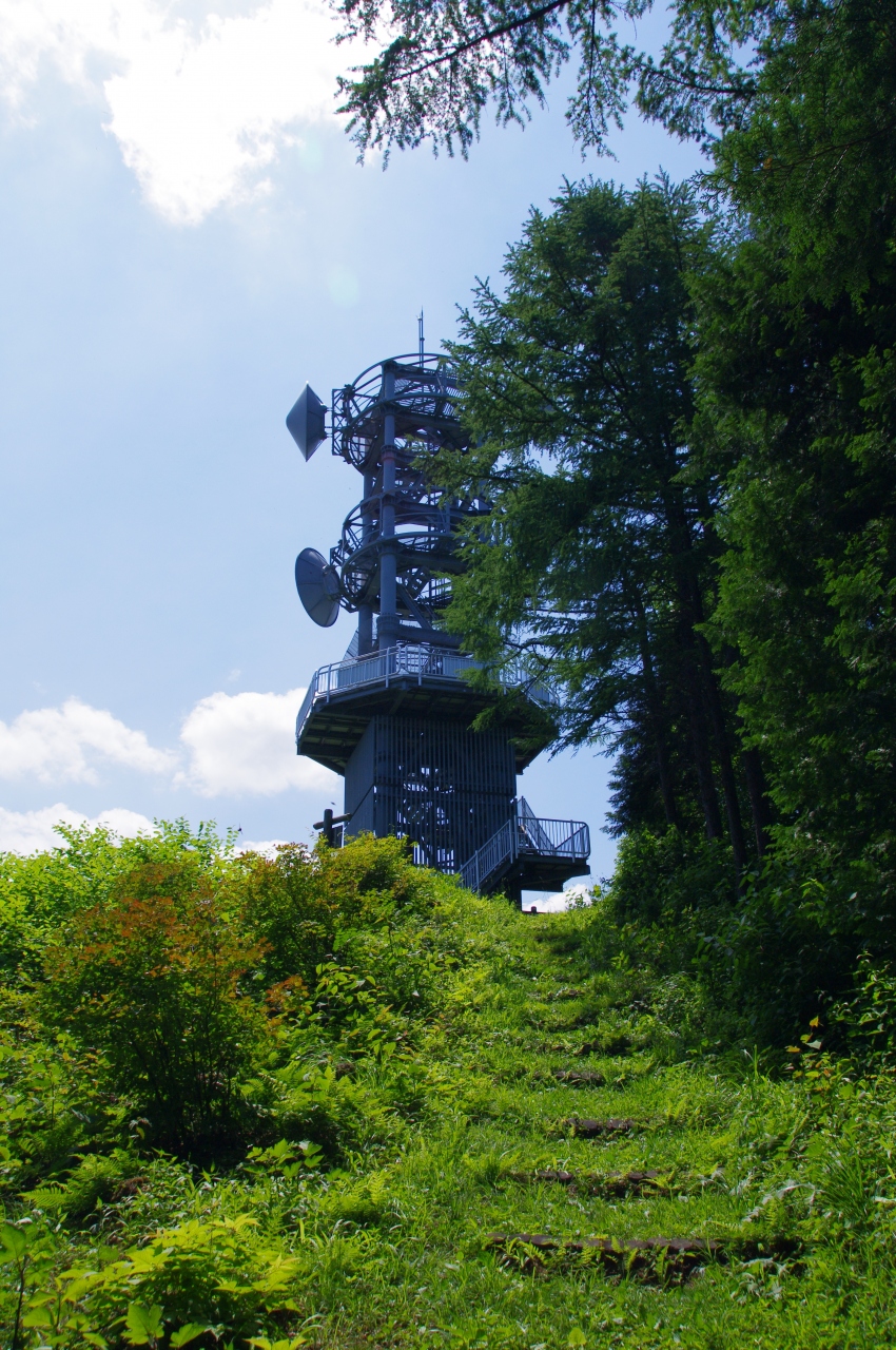 鐘掛城から城峯山まではいわゆる「関東ふれあいの道」。石間峠で林道を横切りました。頂上の鉄塔が見え、疲れましたが、標高1037.8mの頂上に到着。一等三角点が有ります。アンテナが有る鉄塔が途中まで上れるようになっており、展望台となっています。しばし、展望を楽しみました。初夏であり、遠くはよく見えなかったけど、近くの山容が見事でした。