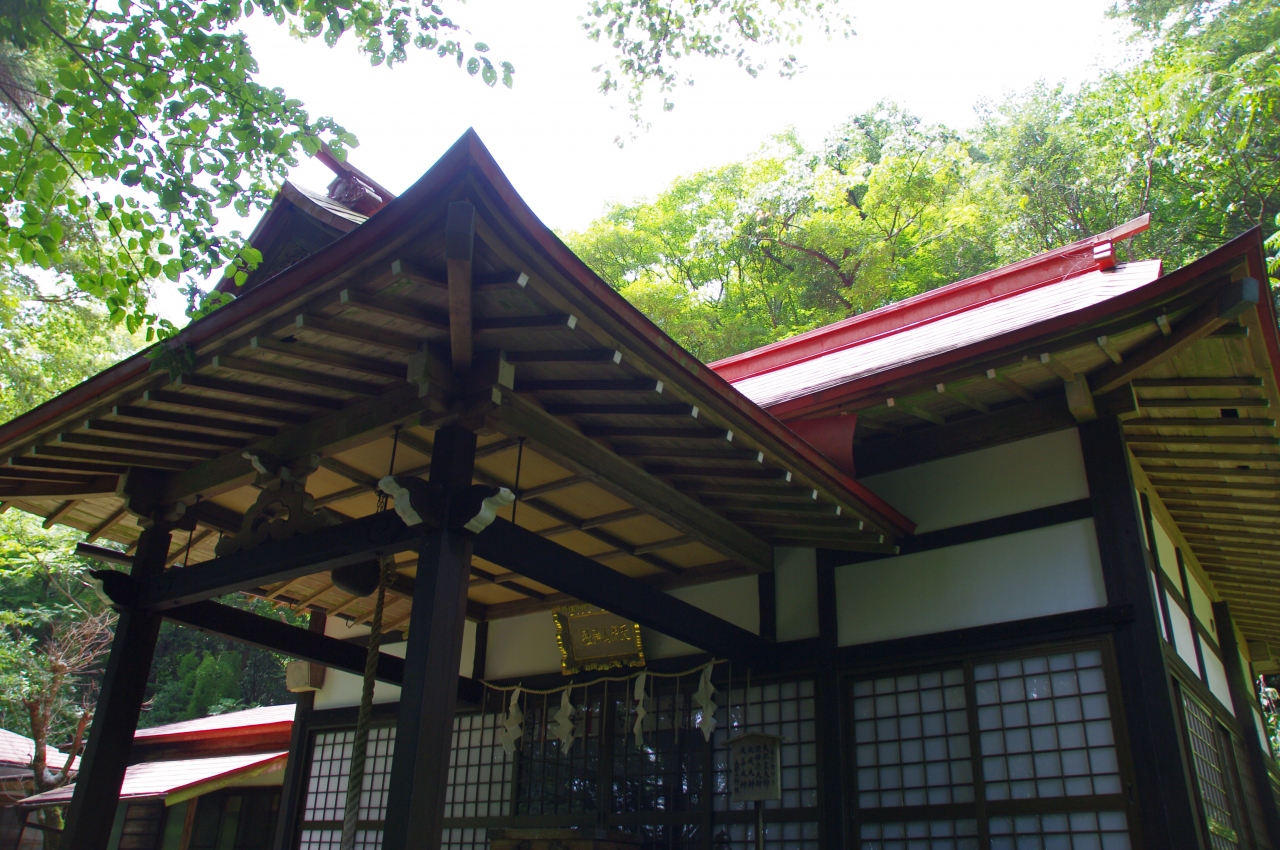 建物が見えてきました。天照山神社です。アジサイが綺麗。御神木の大木が生えています。手水舎に水がほとばしっていました。我が身を清めつつ、このお水を頂きました。おいしかった。お参りしました。- 旅行時期
