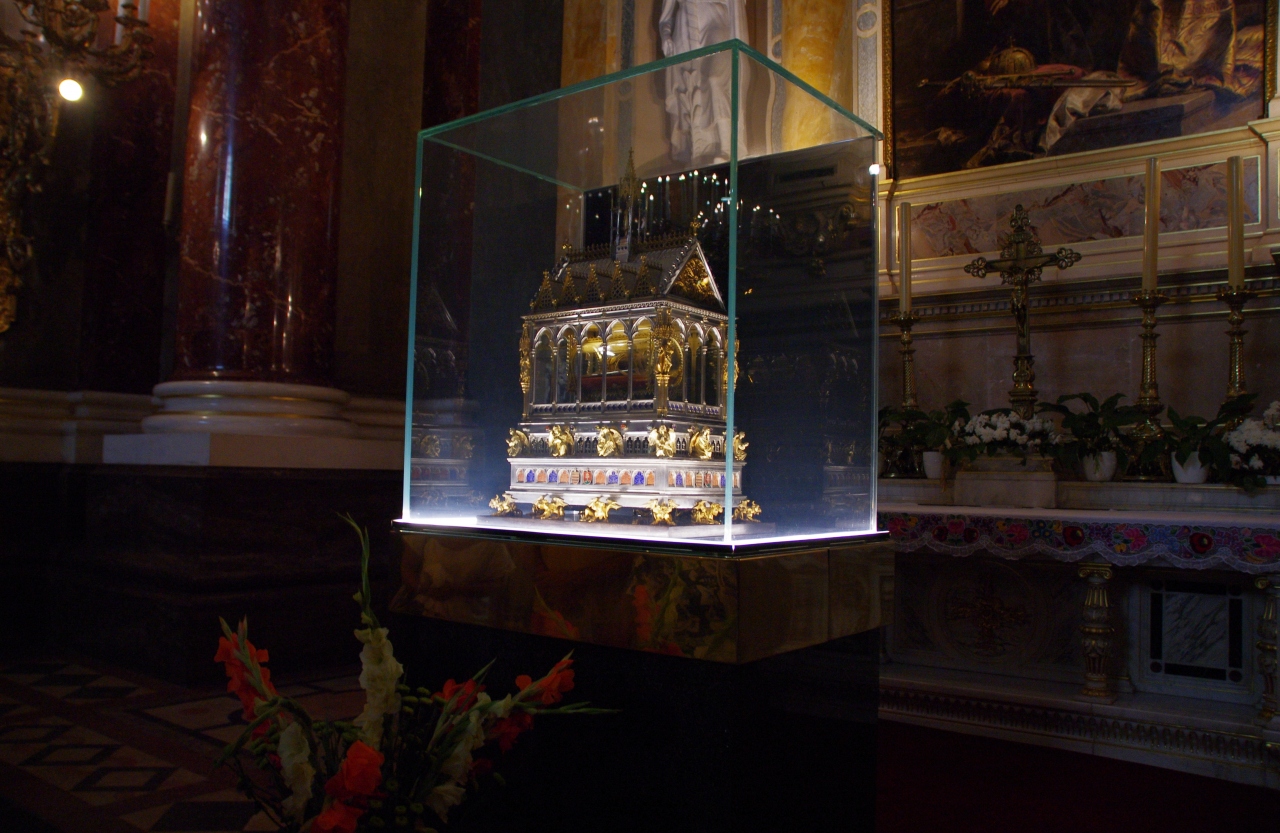 入ってすぐの所にガラスケースが有り、お金を入れる機械が有ります。手元に200フォリントのコインが1枚有り、それを投入しました。ガラスケースがライトアップされました。このとき私は知らなかったのですが、これが聖イシュトヴァーンの右手のミイラのケースです。私達はこのミイラを見なかったな。あーあ。