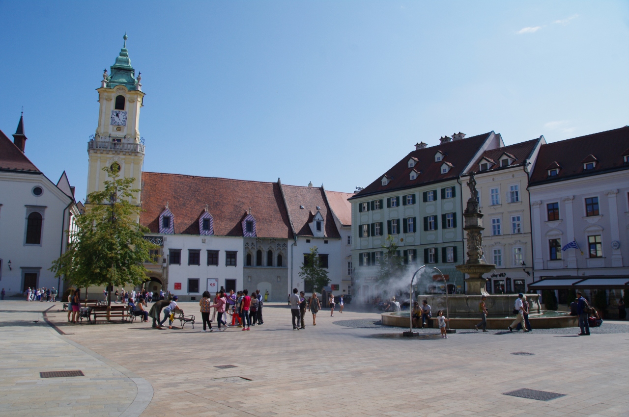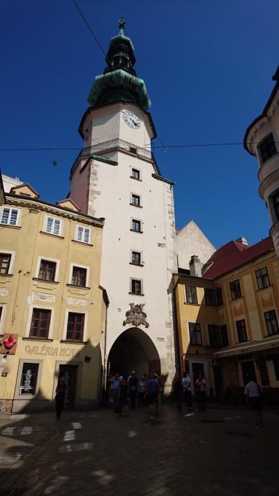 約1km歩いたら、中心部、旧市街地に到着。ドナウの川べりが中心部です。UFOのような展望台が付いたドナウ川の斜張橋が見えました。ドナウ川の向こう側もブラチスラヴァです。